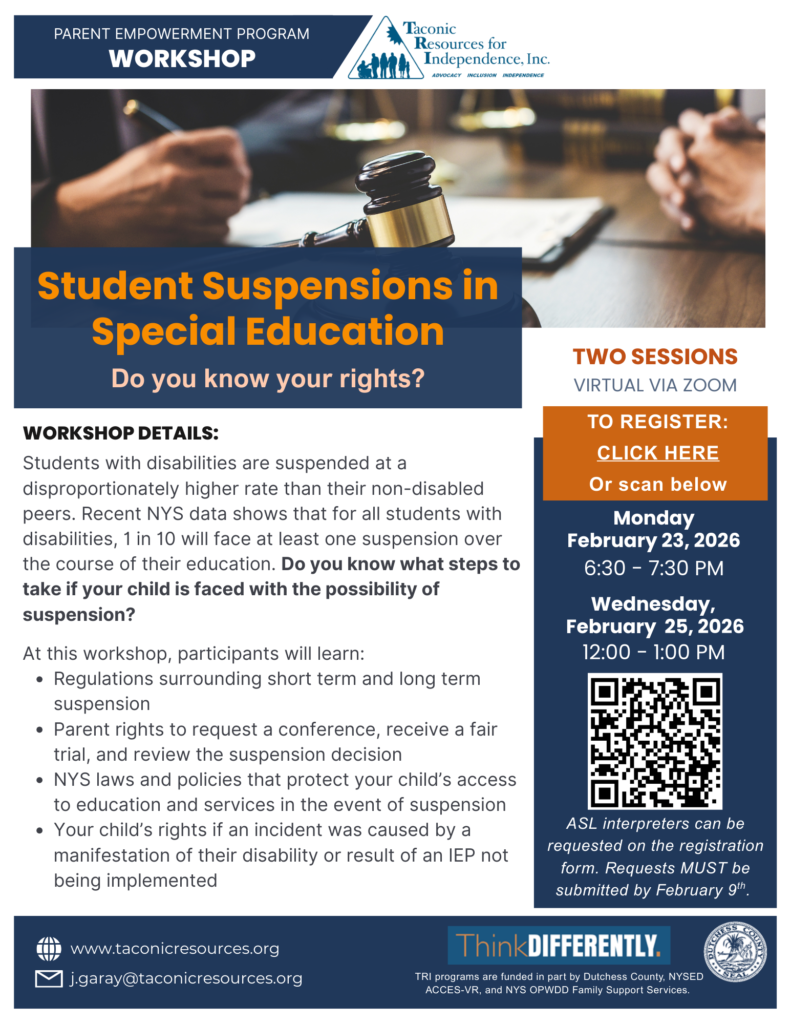 Students with disabilities often face a much higher rate of suspensions than their non-disabled peers. Join our Parent Empowerment Program to learn how to navigate these suspensions as a parent of a disabled student.